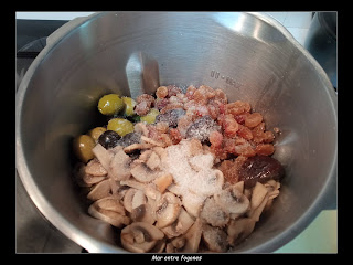 Mezclamos la carne picada con las frutas que tuvimos a remojo en el vermut (las colamos y reservamos el vermut para luego añadirlo a la carne). Añadimos también las aceitunas y champiñones laminados y cocinados (yo los saltee en un chorrito de aceite y cuando estaban casi cocinados se los añadí al relleno).